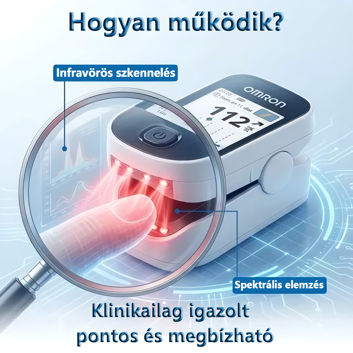 Non-invazív, szúrásmentes technológia – bárhol és bármikor mérhet, fájdalom nélkül.