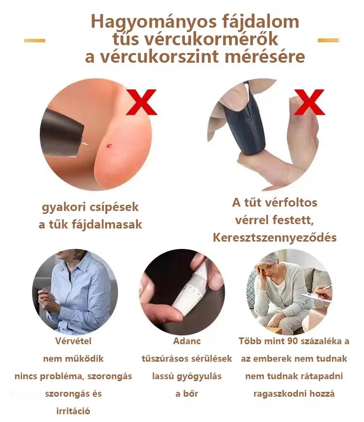 Nincs többé invazív és kockázatos vércukorszint-mérés! Biztonságosan mérje vércukorszintjét, elkerülve a keresztfertőzés és az ujjbegyszúrás kockázatát.