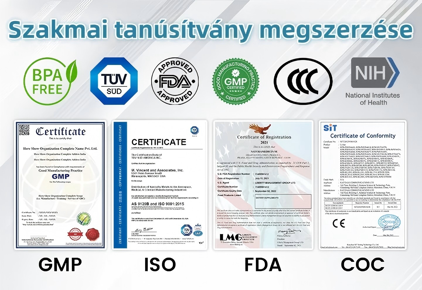 FDA, CE, ISO13485, GMP és egyéb tanúsítvánnyal rendelkezik